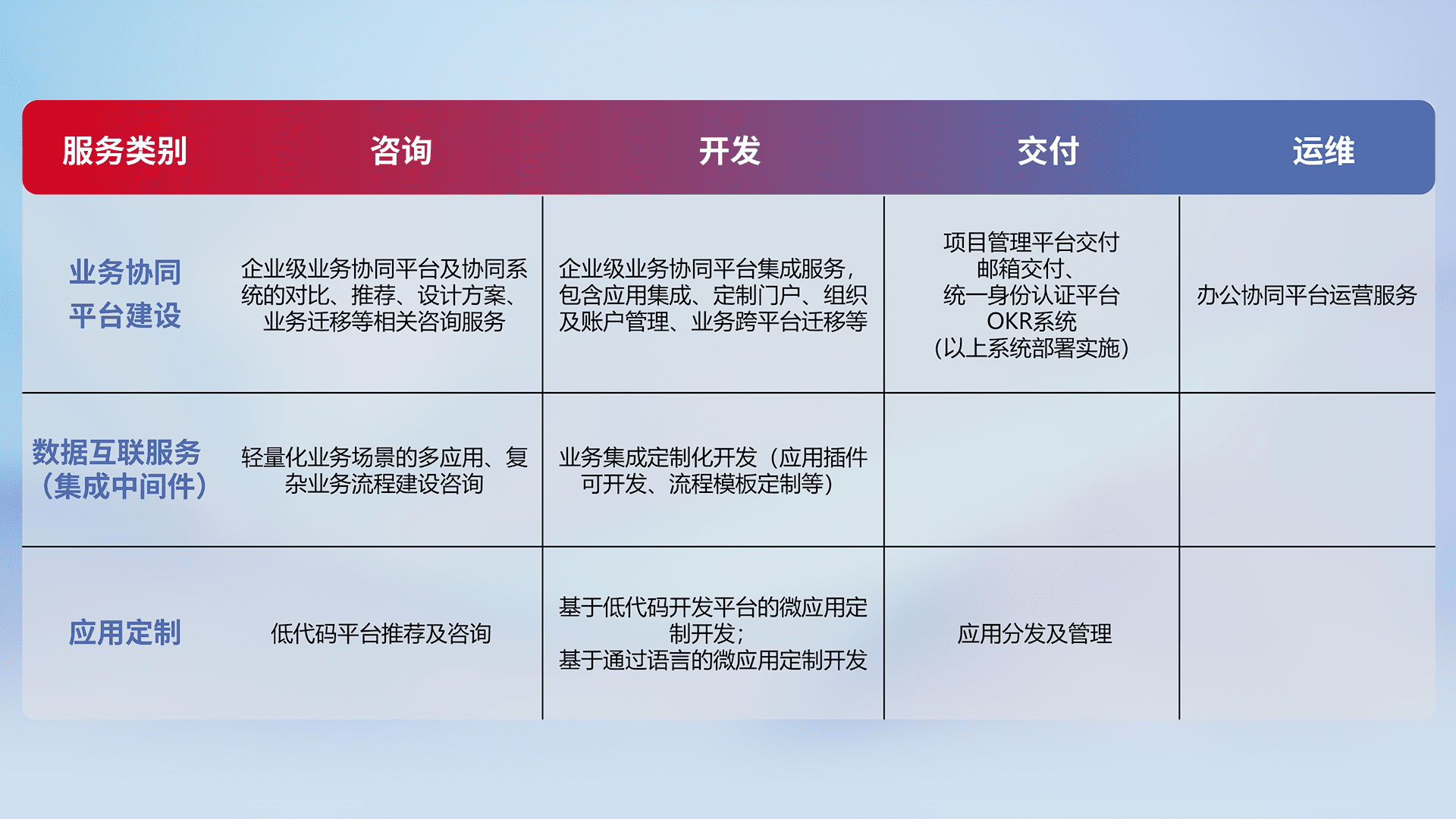 针对钉钉、、、企微、、、IDaas等平台级产品提供产品的规划、、、、方案、、、交付、、、定制化开发等服务,,实现如统一协同办公、、、、智能客户服务、、、、混合会议管理、、、、智能数据查询、、、、等业务场景,,,,实现数字化转型。。