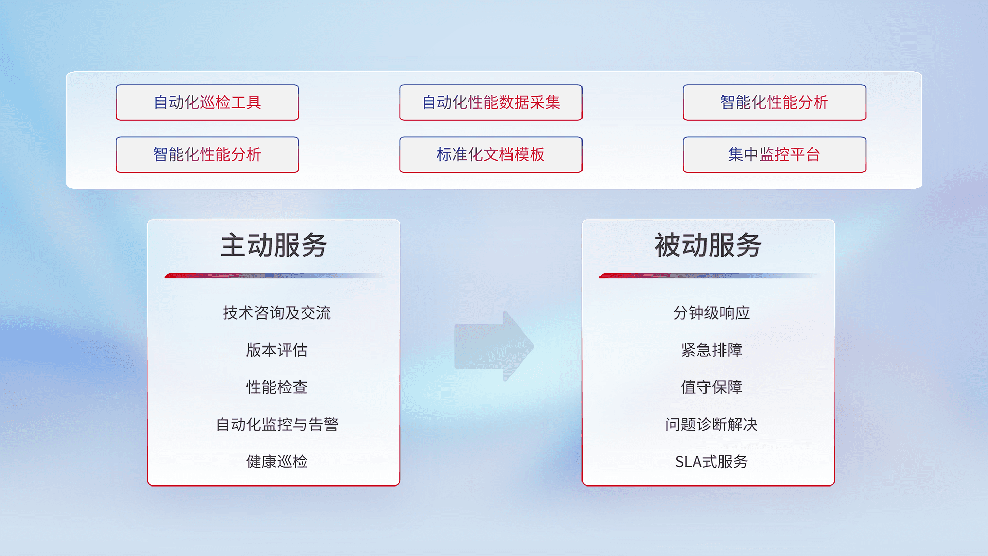 智能化工具和标准化文档,,,,保障服务质量,,提供主动服务(包含技术咨询、、、版本评估、、、、性能检查、、、、自动化监控与告警、、、健康巡检)和被动服务包含(分钟级响应、、紧急排障、、值守保障、、问题诊断解决、、、SLA服务)。。。。